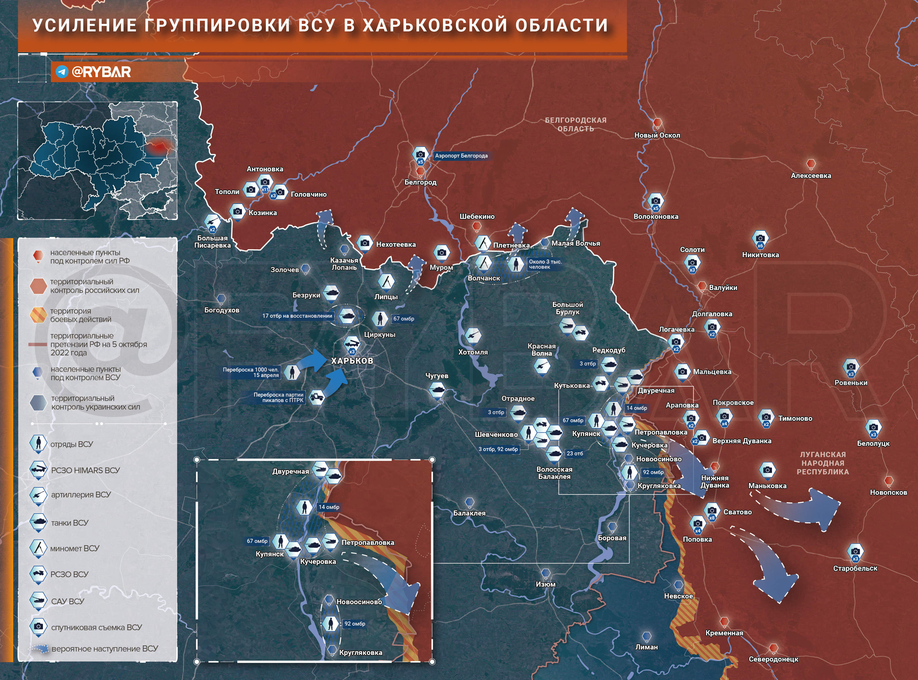 Для выполнения этой задачи и поддержки наступательного потенциала как раз и происходит концентрация ресурсов в Харьковской области. А спутники НАТО ведут съёмку городов Белгородской области и ЛНР.