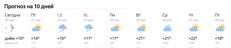 В Челябинске в четверг и субботу будет облачно с прояснениями, в пятницу — переменная облачность, все три дня периодически ожидается небольшой дождь. Днём ожидается до +16, по ночам — от -1 до +4 градусов. По данным долгосрочного прогноза от сервиса «Яндекс.Погода», дожди закончатся к началу следующей недели.