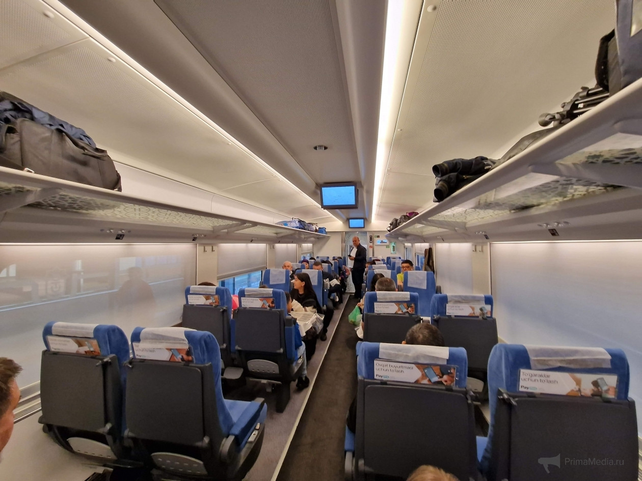 Время в пути примерно 2 часа 30 минут. Средняя путевая скорость поезда — 145 км/ч, но нередко на информационом табло вы увидите, что поезд движется со скоростью выше 200 км в час. Из небольших неудобств — половина мест в салоне расположена по ходу движения поезда, половина — против, так что при выборе мест ориентируйтесь и на это.