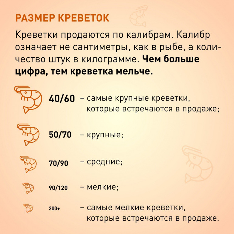 Те самые цифры на упаковке — это калибр креветки, то есть количество штук в килограмме. И важно понимать: чем калибр больше, тем креветка меньше.