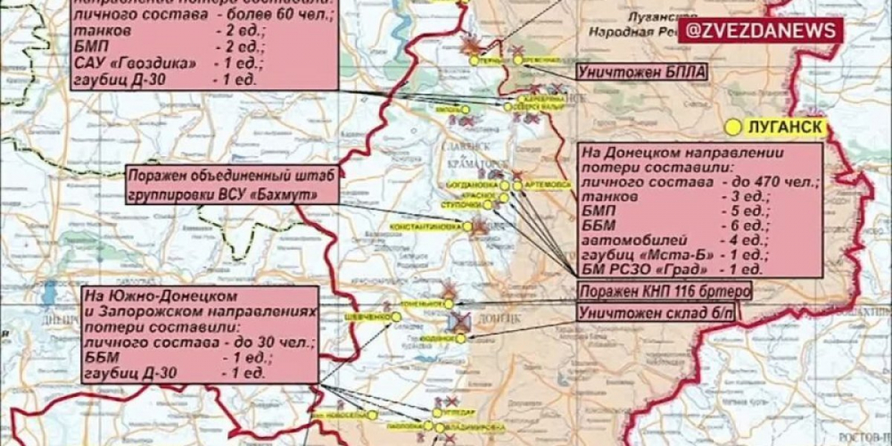 По сообщению Минобороны России, за сутки ВСУ по всей линии соприкосновения потеряли около 525 военнослужащих, 9 бронемашин, 13 автомобилей, 2 гаубицы Д-20 и 2 «Мста-Б», самоходные артиллерийские установки «Акация» и 2 «Гвоздики», реактивную систему «Град».