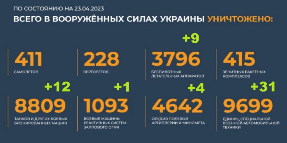 Всего уничтожено в вооруженных силах Украины на 23.04.2023. Брифинг Минобороны