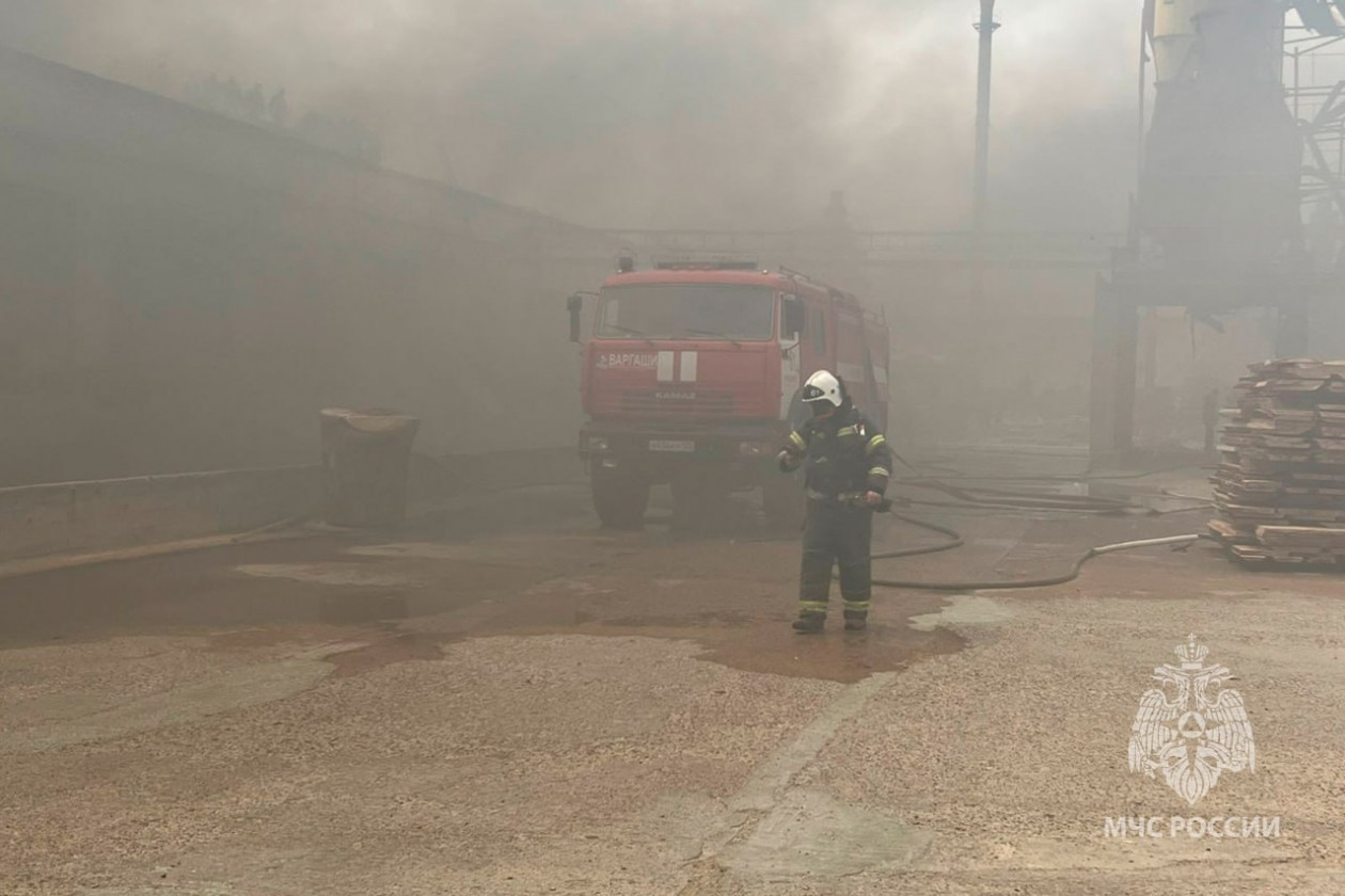 Крупный пожар в деревоперерабатывающем цехе тушат пожарные в Лесозаводске