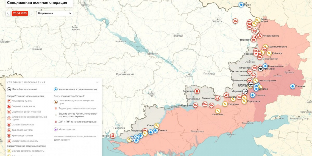 Последние новости о ходе военной спецоперации на Украине на сегодня, 25 апреля 2023 года, новая карта боевых действий на Украине в материале «Интересной России».