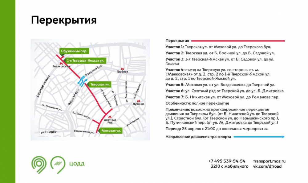 «25 апреля с 21:00 на ряде улиц в центре города будут вводиться временные перекрытия», — говорится в сообщении, которое было опубликовано Telegram-каналом Дептранса.
