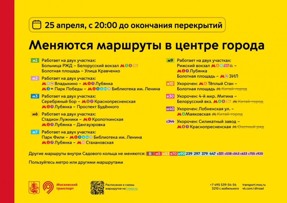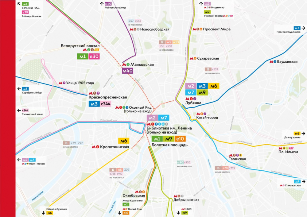 На это время на закрытых участках не будет ходить общественный транспорт. Часть маршрутов укоротят: e10 будет доезжать до Болотной площади, е30 — до Белорусского вокзала, м40 — до станции «Маяковская», с344 — до «Краснопресненской». Автобусы М1, м4, м6 и м7 будут ходить на двух участках.