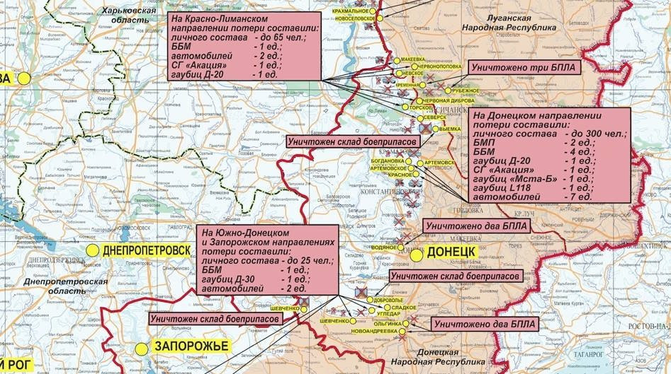 За сутки потери противника на данном направлении составили до 300 украинских военнослужащих и наемников, две боевые машины пехоты, четыре боевые бронированные машины, семь автомобилей, гаубицы Д-20 и «Мста-Б», самоходная артиллерийская установка «Акация», а также одна гаубица L118 производства Великобритании. Кроме того, в районе населенного пункта Выемка Донецкой народной республики уничтожен склад боеприпасов ВСУ.
