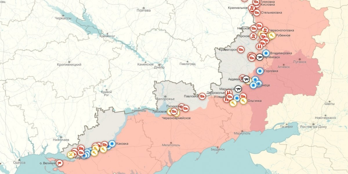 - На Южно-Донецком и Запорожском направлениях ударами оперативно-тактической и армейской авиации, огнем артиллерии группировки войск «Восток» нанесено поражение подразделениям ВСУ в районах населенных пунктов Угледар Донецкой народной республики, Малая Токмачка Запорожской области и Пятихатки Херсонской области.