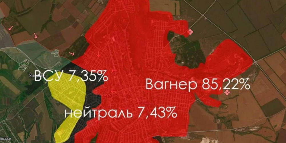 В сети появилась карта приблизительного контроля территорий. Так, согласно нее под контролем ЧВК «Вагнер» находится 85,22% территории Артемовска (Бахмута), а под контролем ВСУ всего 7,35%. В серой зоне — 7,43%.
