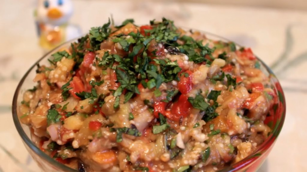 На мангале необходимо запечь овощи до обугливания кожицы. После этого кожура снимается. Баклажан рубится крупным кубиком. Помидоры, перец и лук нарезаются вместе с зеленью. Все продукты смешиваются и в закуску добавляются специи по вкусу.