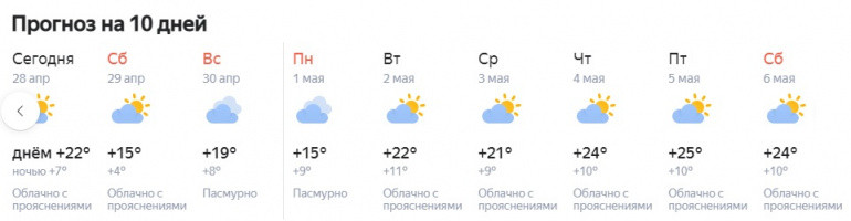 В Челябинске вплоть до воскресного вечера существенных осадков не ожидается, по ночам будет от +3 до +10, днём в пятницу и воскресенье — до +23, в субботу — максимум до +17 градусов. По данным долгосрочного прогноза от сервиса «Яндекс.Погода», дождей и минусовых температур в прогнозе на следующую неделю тоже нет.
