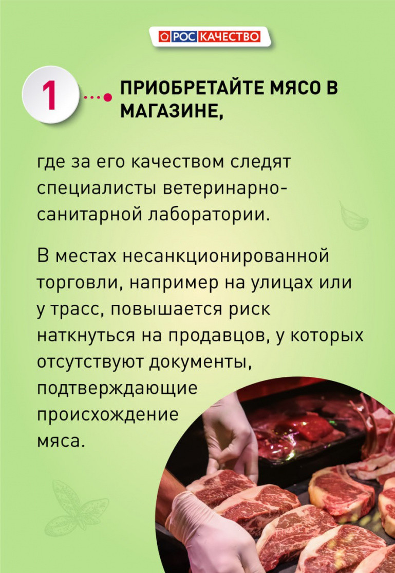Также она советует следовать советам с инфографики. Одно из главных правил в том, чтобы покупать мясо в магазинах, а не на уличных развалах.