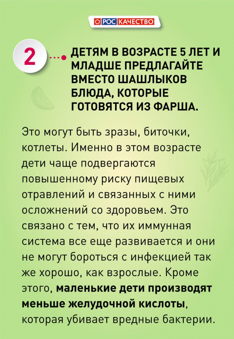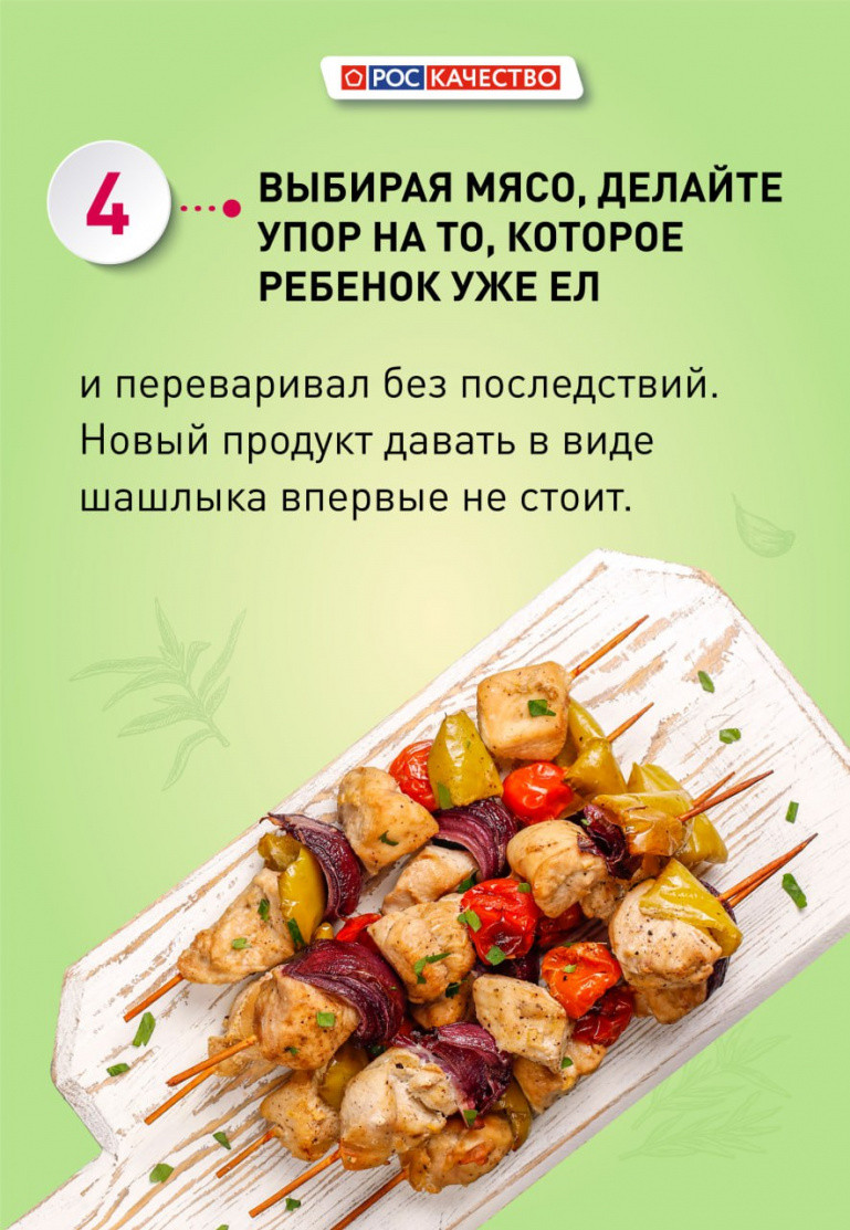 — Если у вашего ребёнка есть проблемы со здоровьем, в частности заболевания желудочно-кишечного тракта, то прежде чем отправляться жарить мясо на природу, следует проконсультироваться с педиатром и гастроэнтерологом, — считает Василиса Лютая.