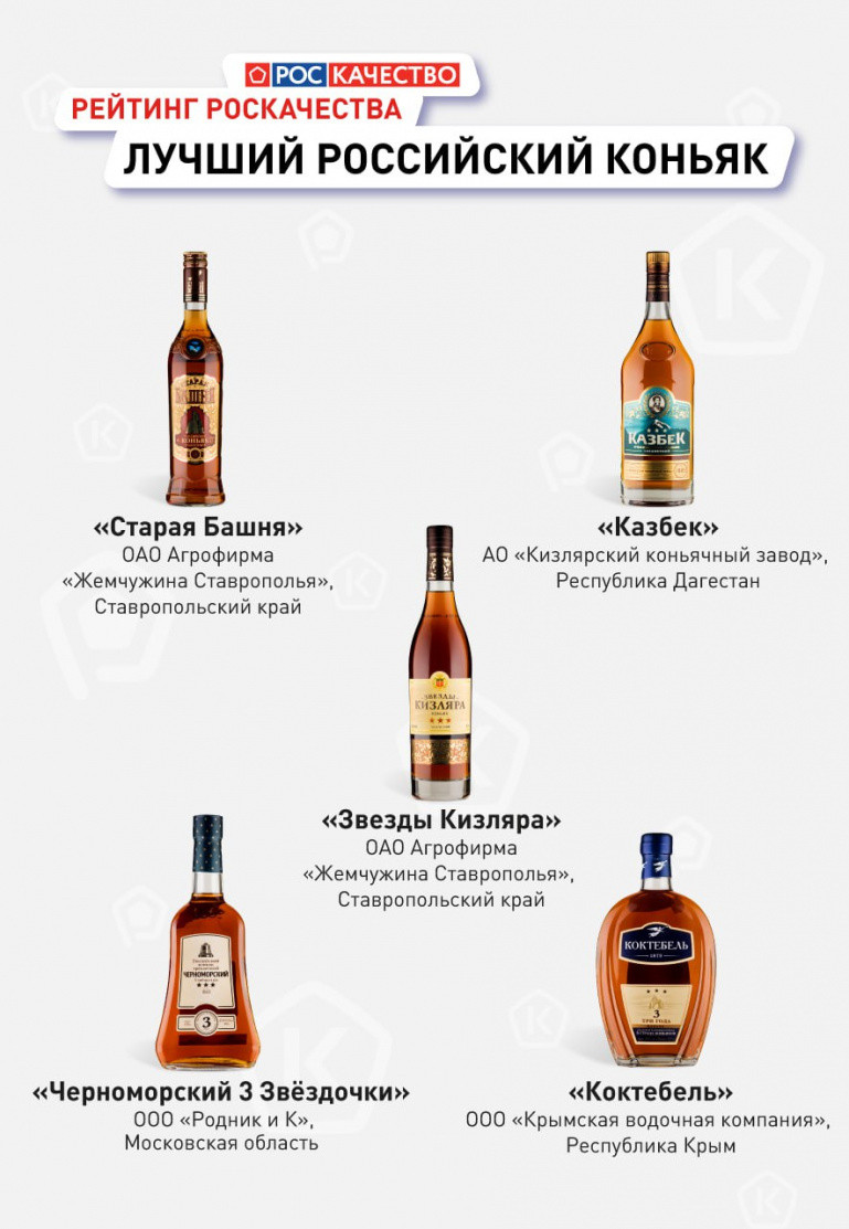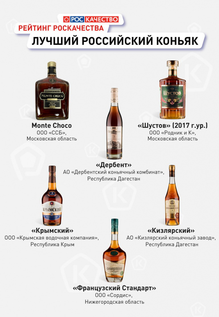 Среди ставших лидерами испытаний — коньяк пятилетней выдержки Monte Choco и 10 марок коньяка трехлетней выдержки: «Шустов», «Дербент», «Крымский», «Кизлярский», «Французский Стандарт», «Старая Башня», «Казбек», «Звезды Кизляра», «Черноморский 3 звёздочки», «Коктебель».