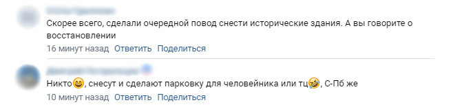 Также в социальных сетях не исключают, что заинтересованные лица таким образом просто создали очередной повод для последующего сноса еще одного исторического здания, на месте которого могут построить парковку для нового «человейника» или торговый центр, что для Северной столицы уже становится «традицией».