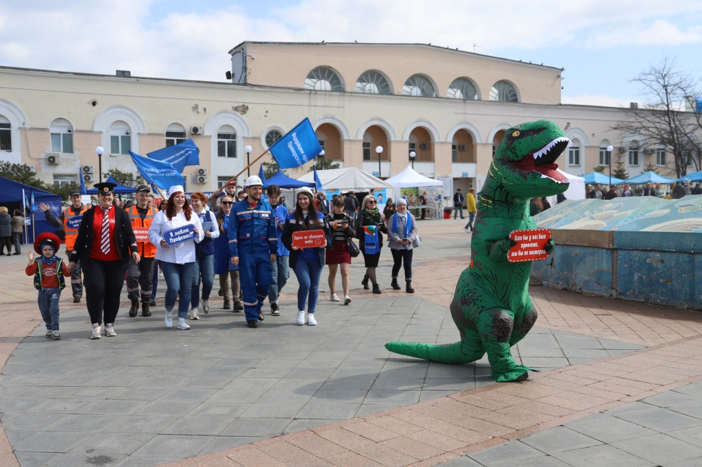 Горожан приветствовал динозавр с табличкой “Если бы был профсоюз — мы бы не вымерли”, рядом стоял “развиртуализированный” чат-бот Валера, с помощью которого приморцы могут конфиденциально задать любые вопросы на тему трудовых отношений в ТГ-канале “Профсоюзы Приморья” (12+), а у баннера краевой федерации профобъединений сотни желающих охотно снимались в профессиональной униформе.