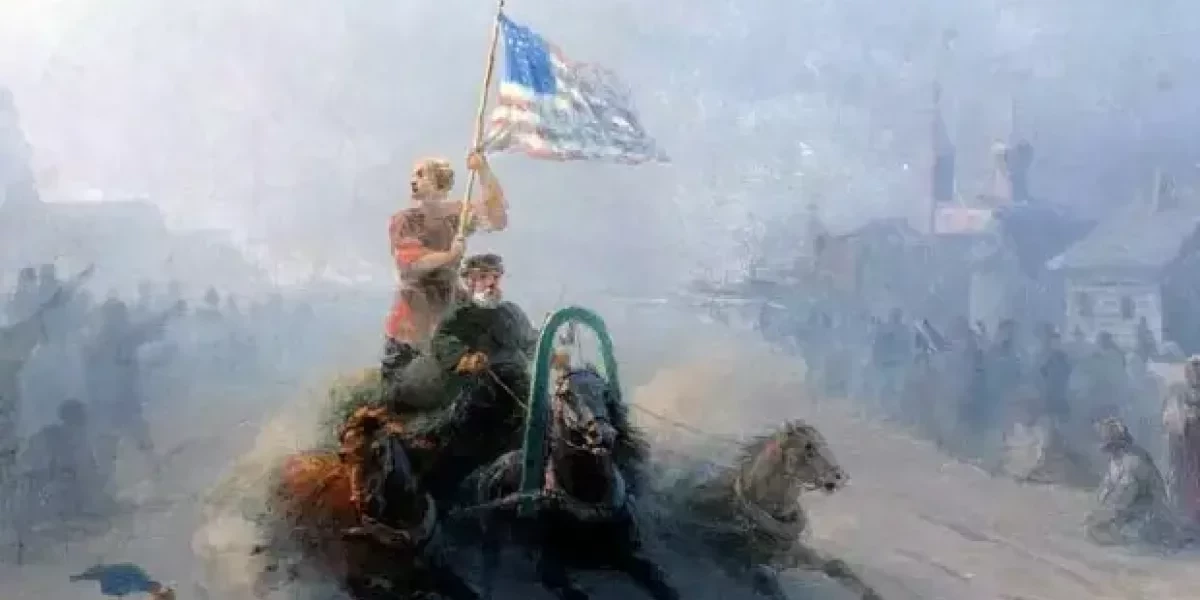 На известной картине российской деревеньки с бревенчатыми домами, церковью и множеством местных жителей в центре композиции расположилась русская тройка, вот только не совсем понятно, почему женщина на этой тройке размахивает американским флагом. Давайте попробуем разобраться, что же здесь происходит.
