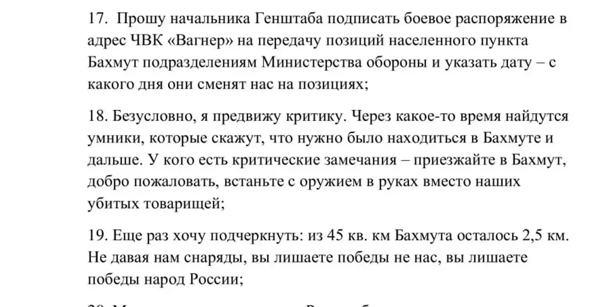 — Я вывожу подразделения ЧВК Вагнер из Бахмута, потому что при отсутствии боеприпасов они обречены на бессмысленную гибель, — заявил Пригожин в обращении, адресованном военному командованию, президенту и народу России.