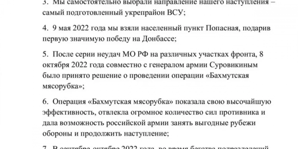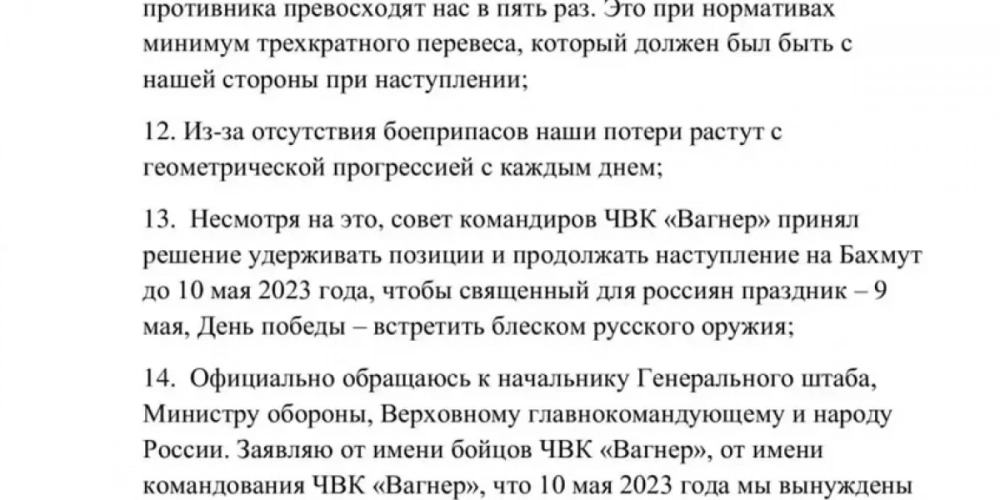 По словам Пригожина, к 9 Мая вагнеровцы хотели овладеть Бахмутом, но увидев ситуацию глубоко возмутились. Ни на одно обращение отправленное им в Минобороны ранее, ответ не поступил.