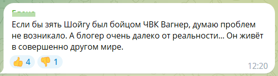 «Если бы зять Шойгу был бойцом ЧВК «Вагнер», думаю проблем не возникало. А блогер очень далеко от реальности... Он живет в совершенно другом мире», — отмечает одна из пользовательниц.
