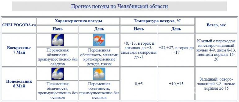 В Челябинске 7 мая прогнозируются переменная облачность и слабый дождь с грозой. Температура воздуха днём составит от 24 до 26 градусов тепла. Дополнит погодную картину южный ветер, переходящий на северо-западный, с порывами до 18 м/с.