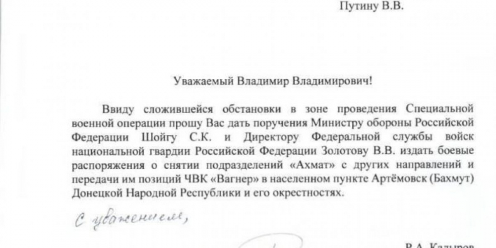 В нём глава ЧР просит Верховного главнокомандующего отдать поручение на передислокацию частей «Ахмат» в Артёмовск.