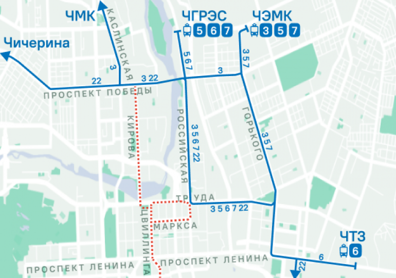 - Трамвай № 3 «ЧМК — Российская — Горького — ЧЭМК — проспект Победы — ЧМК»;