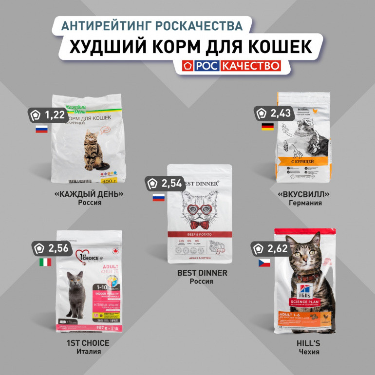 Ранее «Пчела» уже писала об этом исследовании. Мы назвали 17 кормов, в которых нашли пестициды. Лучшим же неожиданно оказался дешёвый российский кошачий корм, который есть во всех зоомагазинах.