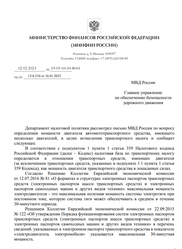 Изначально ФНС разослала письмо Минфина России от 06.02.2023 № 03-05-04-04/9167 по вопросу определения мощности двигателя автомототранспортного средства, имеющего несколько двигателей, для исчисления транспортного налога.