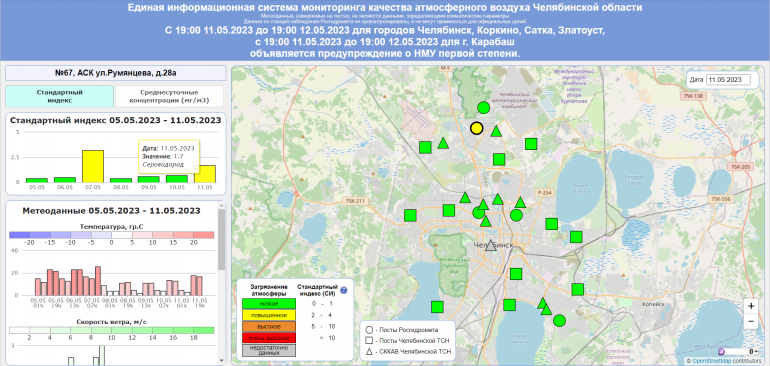 С вечера четверга, 11 мая, в Челябинске, Златоусте, Карабаше, Коркино и Сатке будет действовать режим неблагоприятных метеоусловий. Он продержится в течение суток, предупредили синоптики. В эти минуты один из постов наблюдения фиксирует повышенное загрязнение воздуха в Металлургическом районе областного центра.