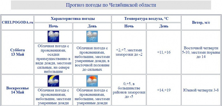 В субботу, 13 мая, в Челябинской области ожидается облачная и сырая погода. Во многих районах днём пройдут дожди, местами сильные, а предстоящей ночью температура воздуха опустится до минус пяти градусов. Об этом сообщается на сайте регионального Гидрометцентра.