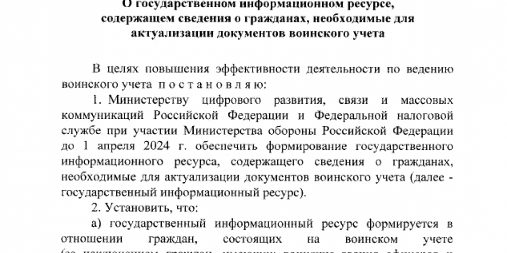Президент поручил ФНС и Минобороны идентифицировать россиян, «состоящих на воинском учете и не состоящих, но обязанных находиться на воинском учете и не пребывающих в запасе» с помощью Единого федерального информационного регистра, в котором собраны сведения о населении. Правительство должно утвердить этапы формирования ресурса, решить организационные вопросы и определить его оператора.