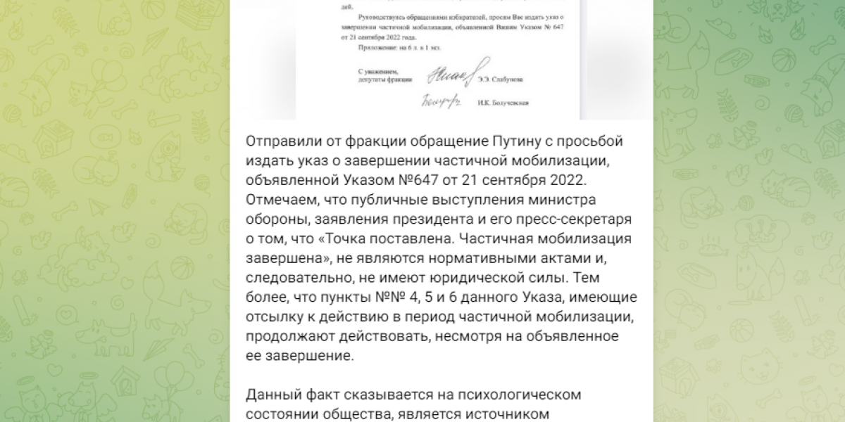 «Отправили от фракции обращение Путину с просьбой издать указ о завершении частичной мобилизации, объявленной Указом №647 от 21 сентября 2022.