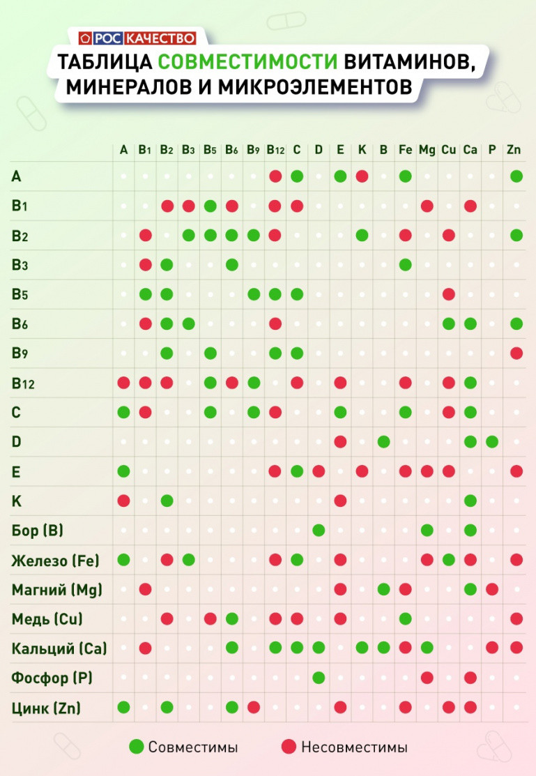 Помочь сориентироваться поможет таблица совместимости витаминов, минералов и микроэлементов.