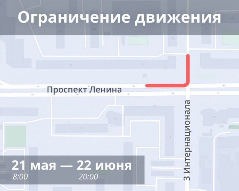 Движение временно ограничат на улице 3-го Интернационала в районе пересечения с проспектом Ленина. Там будут работать коммунальщики. Об этом сообщили в мэрии в субботу, 20 мая.