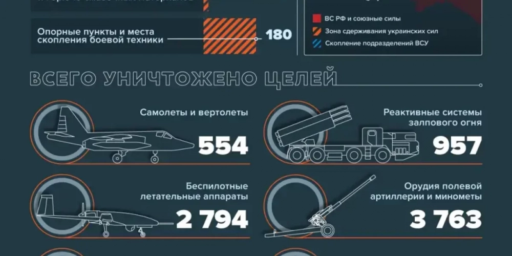 Минобороны РФ сообщает о нанесении ударов по пунктам дислокации иностранных наемников в Марково, Краматорске и Новоосиново, в результате чего уничтожены более 70 боевиков и свыше 100 ранены. Вместе с этим поражены 67 артиллерийских подразделений Вооруженных сил Украины (ВСУ) и 92 района скопления войск. Ликвидированы два склада боеприпасов и два топливных хранилища.