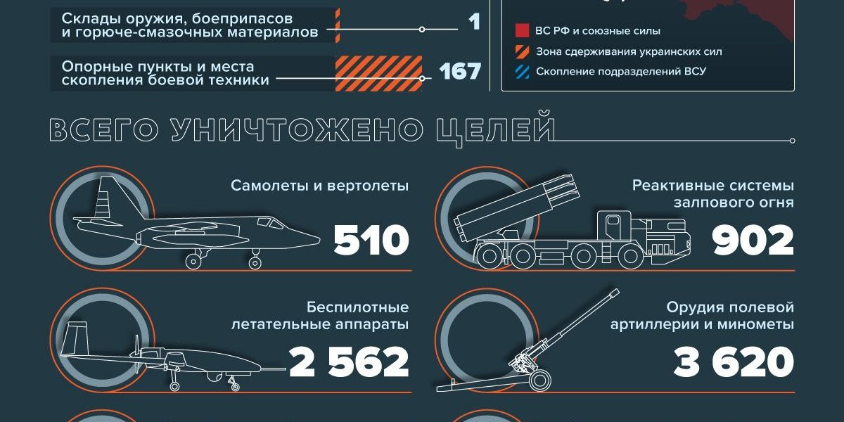 ВС РФ уничтожили радиолокационную станцию контрбатарейной борьбы производства США AN/TPQ-50, а также поразили шесть пунктов управления ВСУ в Донбассе.