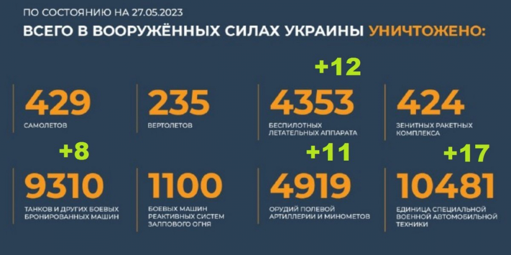 Помимо личного состава Вооруженные силы Украины (ВСУ) потеряли в боях с «вагнеровцами» 309 танков, 83 реактивные системы залпового огня, 5 самолетов, 4 вертолета, 282 беспилотника и тысячи единиц другой техники. Уничтожены 379 складов боеприпасов и горюче-смазочных материалов, 1613 укрепленных точек, 533 опорных пункта.