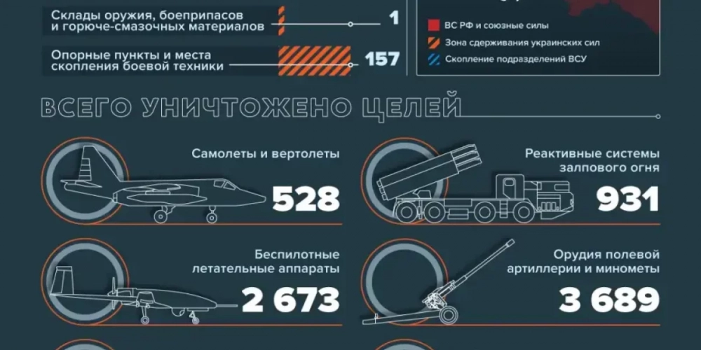 Средствами противовоздушной обороны за сутки сбито четыре украинских беспилотных летательных аппарата в районах населенных пунктов Новая Тарасовка Харьковской области, Новоукраинское, Графское и Сладкое Донецкой Народной Республики. Кроме того, в районе города Первомайск Луганской Народной Республики перехвачены два реактивных снаряда «Хаймарс».