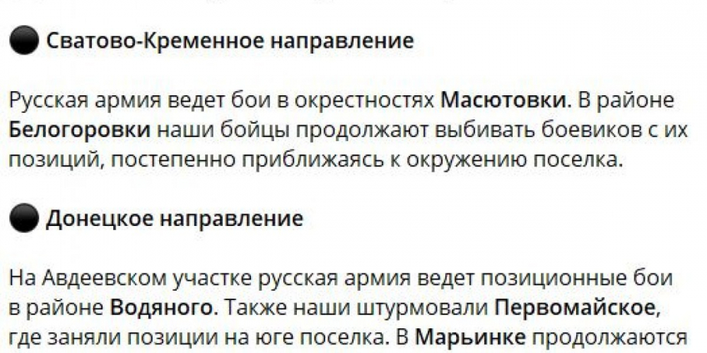 Подполковник Народной милиции ЛНР в отставке Андрей Марочко заявил, что Киев активно пополняет склады с боеприпасами на Артемовском направлении, в том числе в районе Часова Яра. Также идет переброска боеприпасов на объекты в районах Константиновки и Дружковки.