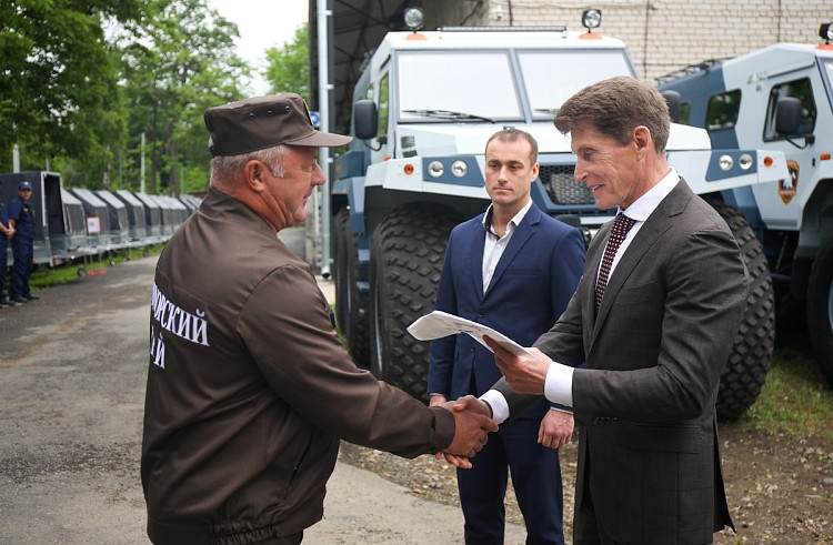 Также глава региона принял участие в торжественной церемонии передачи более 50 единиц оборудования и новых машин подразделениям минГОЧС Приморского края. Спасатели получили квадроциклы, болото— и снегоходы, прицепы для их оперативной доставки. Очень важным приобретением стали три ТРЭКОЛА — машины, способные передвигаться по снежным заносам и болотам.