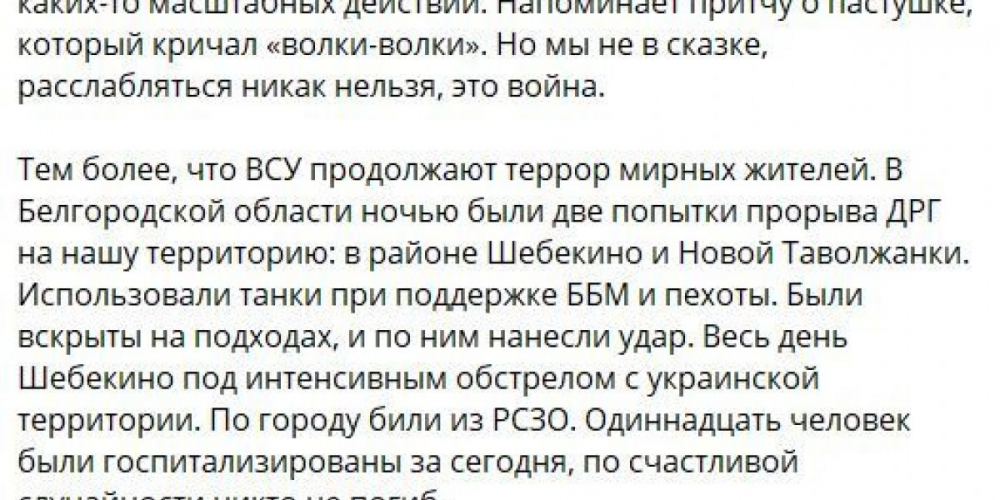 Рано утром начался бой на КПП, который подвергся обстрелу из танков и артиллерии. Под Новой Таволжанкой противник пытался продвинуться силами до роты. А накануне украинские формирования несколько суток били по самому Шебекино, а не военным объектам и укреплениям.