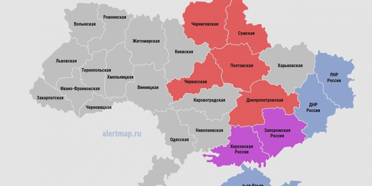 Согласно онлайн карты воздушных тревог на Украине, по состоянию на 01:25, 17 декабря 2022 года, сирена звучит в Черниговской, Сумской, Полтавской, Черкасской, Днепропетровской областях Украины, а также на подконтрольных Киеву территориях Херсонской и Запорожской области России.