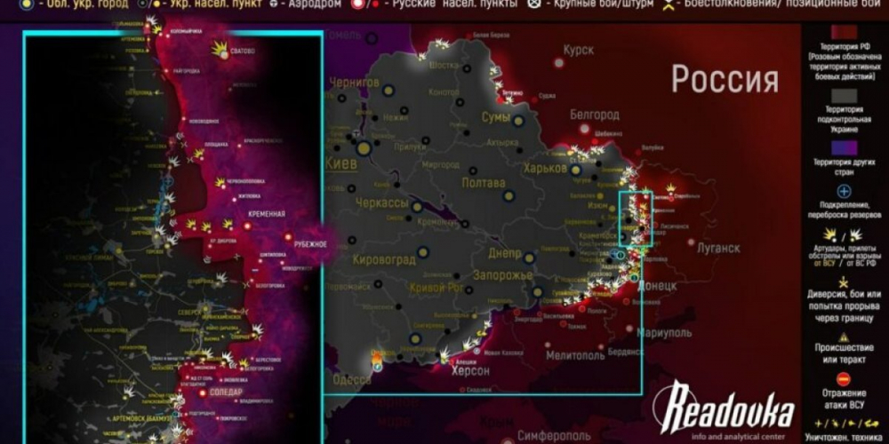 - Сватово-Кременное направление: российская армия начала наступление под Кременной. Бойцы продвинулись до Ямполовки ДНР и выбили тероборону в районе Дибровы, а также давят у Макеевки ЛНР. Продолжаются бои в Двуречье на Купянском участке, параллельно ВС РФ наступает на позиции ВСУ в Горобьевке и Гряниковке Харьковской области. Кроме того, продвижение 144 мсд ВС РФ и освобождение Белогоровки открывает еще один выход на Северск;