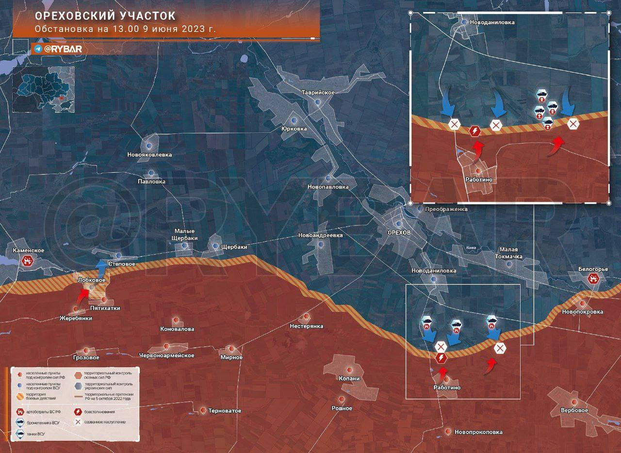 Карта боевых действий: Ореховский участок обстановка по состоянию на 14.00 9 июня 2023 года