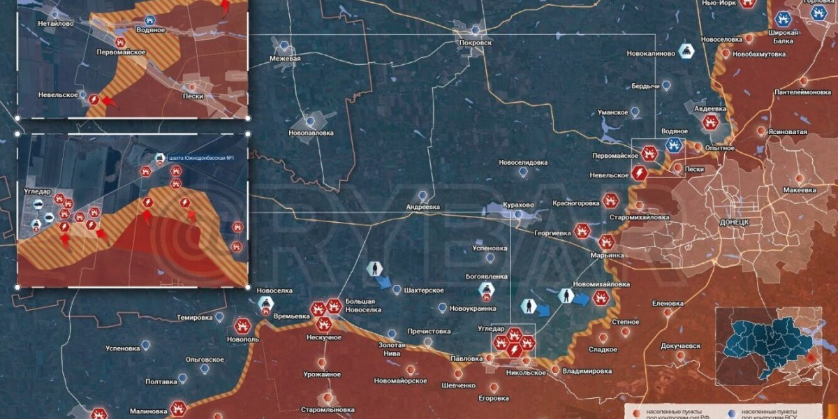 - Часть личного состава ВСУ была выведена из Угледара в район Южно-Донбасской шахты, где оборудован полевой медпункт. Остальные были отведены вглубь города, а дороги и подступы, в том числе на улице Шахтерской, дистанционно заминированы.