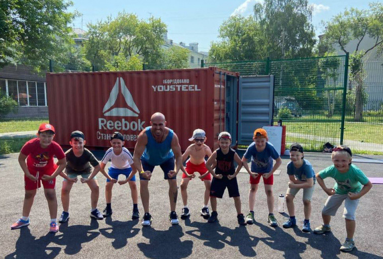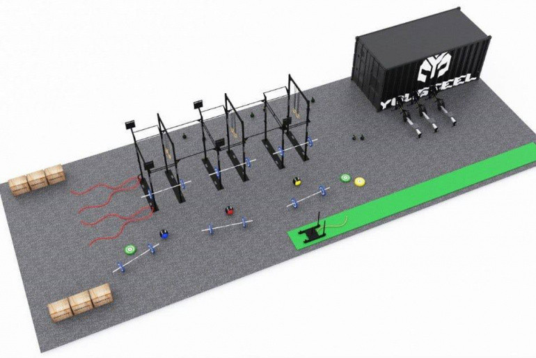 На площадке разместили специальный модуль с профессиональным оборудованием: многофункциональной рамой для CrossFit, штангами, отягощением, блинами, канатами, гирями и кардиотренажёрами