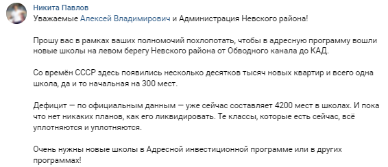 Упомянутый Невский район прирастает жильем крайне активно. Застройщикам нравятся территории у берегов Невы, которые можно застроить видовыми жилыми комплексами. При этом жители ощущают нехватку учебных мест и просят у чиновников поспособствовать решению ситуации.