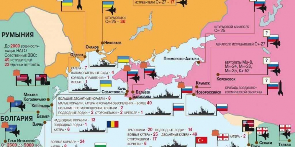 На карте представлена дислокация сил РФ и НАТО. Очень все плотненько…Наш Крым держит на контроле всю акваторию Черного моря. Нельзя сказать, что оборонные возможности Крыма безграничны. В связи с переходом РФ на комплексы с гипер скоростью, в НАТО предпринимаются меры по сокращению времени доставки зарядов к объектам в России. С этой целью в Северодонецке и Мариуполе строятся базы по стандарту НАТО. В Николаеве строится база ВМФ, а в Очакове (Азов) пункт обслуживания судов. Активно обустраиваются позиции баз в Румынии. В акватории присутствует ВМФ Турции. И вот вся эта сила добивается изоляции России. НАТО хотелось бы затруднить выход России в Средиземноморье. НАТО не Украина нужна. Крым! Крым — замок для всего Черного моря.