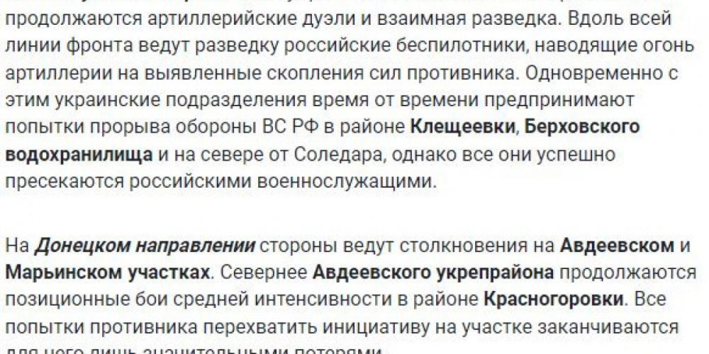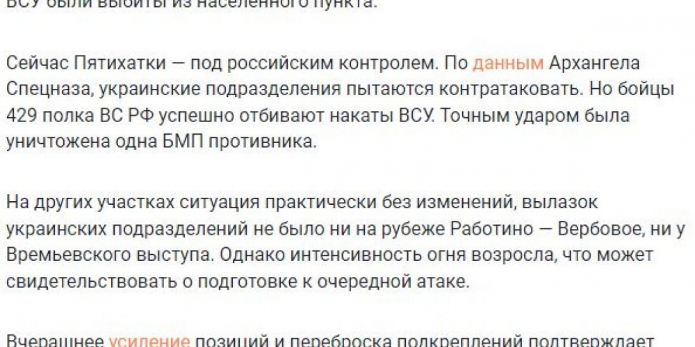 И все заходящие в Пятихатки силы противника уничтожаются российской артиллерией, танками либо авиацией. Более того, 5-ый батальон 128-й гшб ВСУ и вовсе вывел остатки своих сил и тяжелой техники из населенного пункта под натиском ВС РФ, которые занимают более выгодные позиции на высотах, в то время как ВСУ засели в низинах.